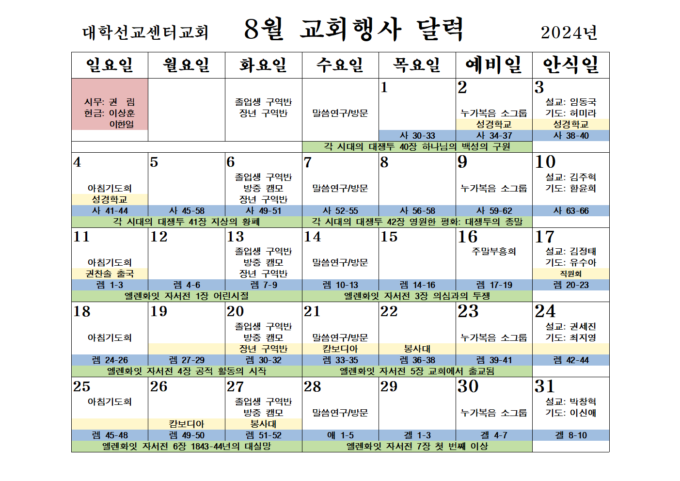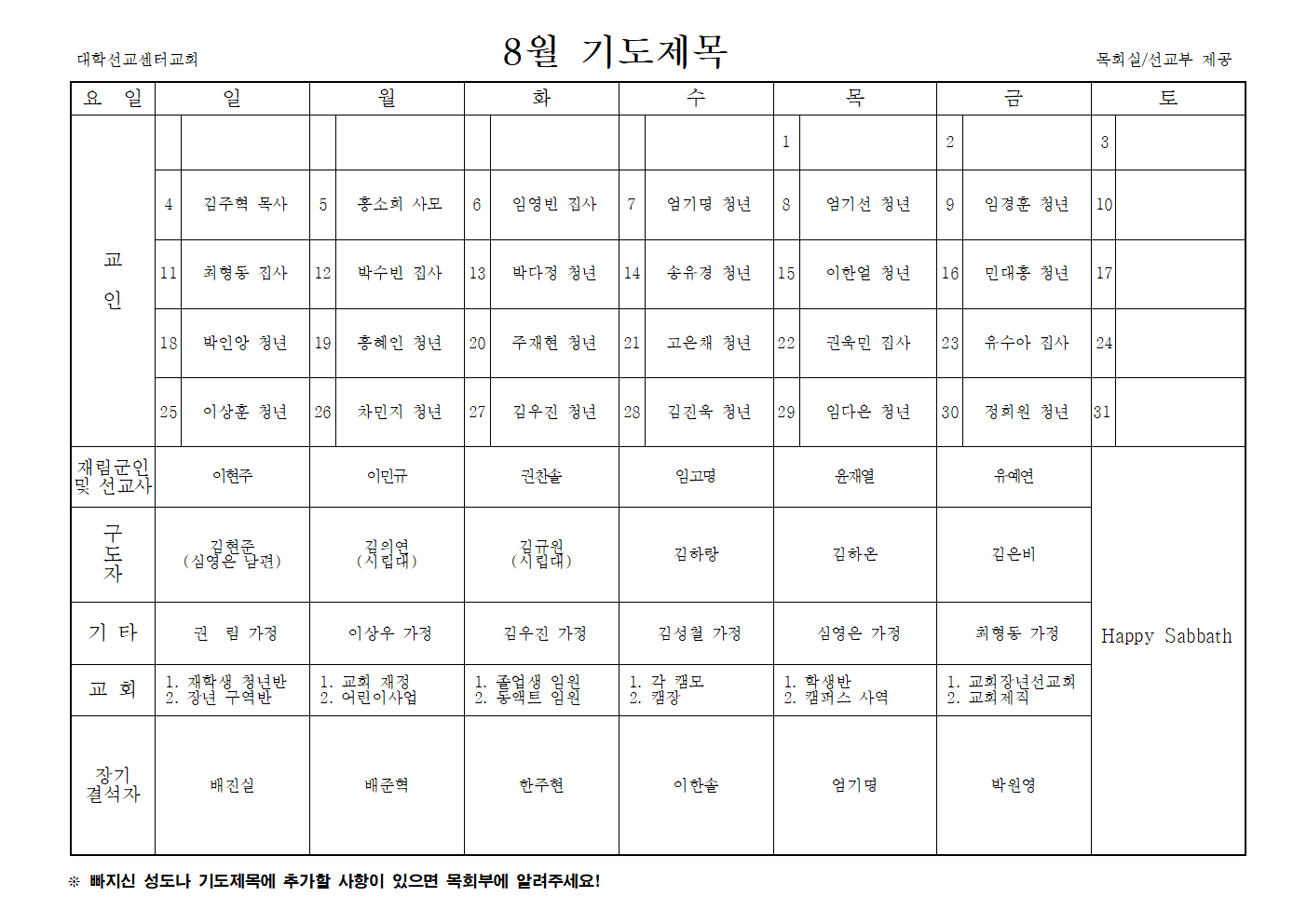8월 기도제목, 교회행사